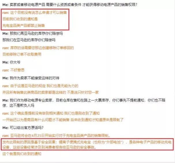 充电宝疑似禁售 今天,这张跟客服的聊天截图刷爆了各大卖家群: 大意就是4月25号后,充电宝类的产品,都被限制上架销售了。主要是出于安全因素。 一时间众议纷纷,很多做相关产品的卖家忧心忡忡。 第一时间也有很多卖家找了各种不同的客服去确认此事,但是得出的答案都不同。 目前,还没有得到亚马逊的官方通知,建议打算开发此类产品的卖家,先从客服和招商经理那边了解清楚。