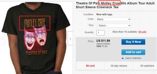Motley Crue Inc.与哥斯拉一样,在八月已经立案4次了,小Jude在亚马逊、eBay等平台仍看到不少的卖家正在经营Motley Crue的产品。还是那句话,未得到授权切勿卖侵权产品。
