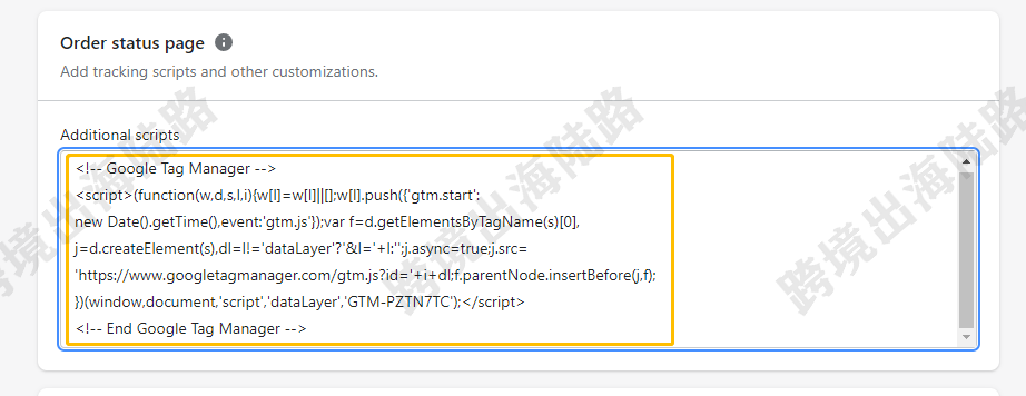 20.滑动鼠标到Order status page,把复制的第一段GTM代码继续粘贴在Additional scripts