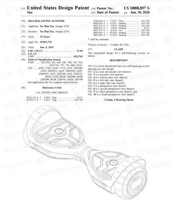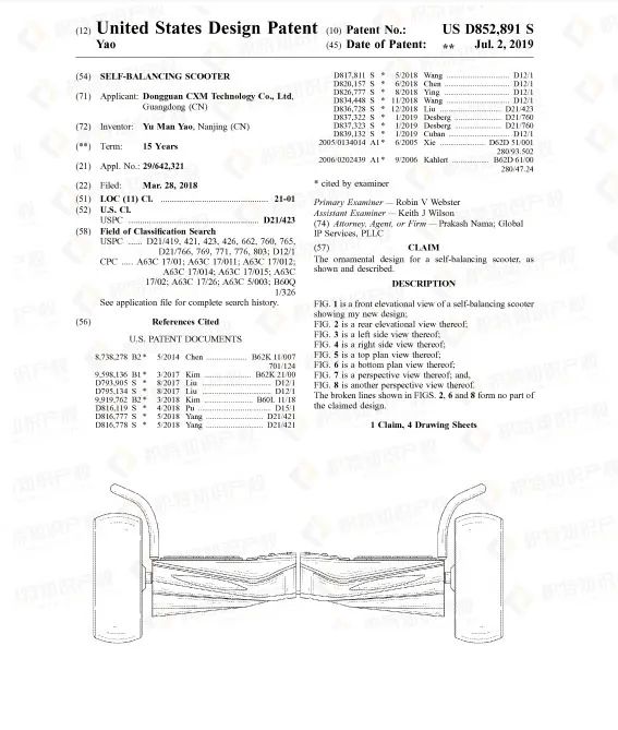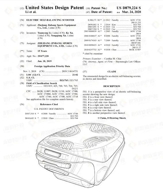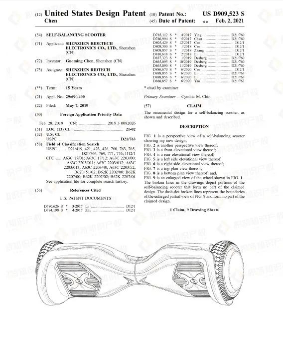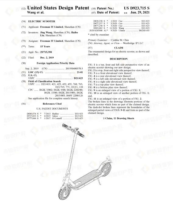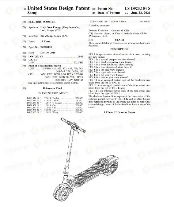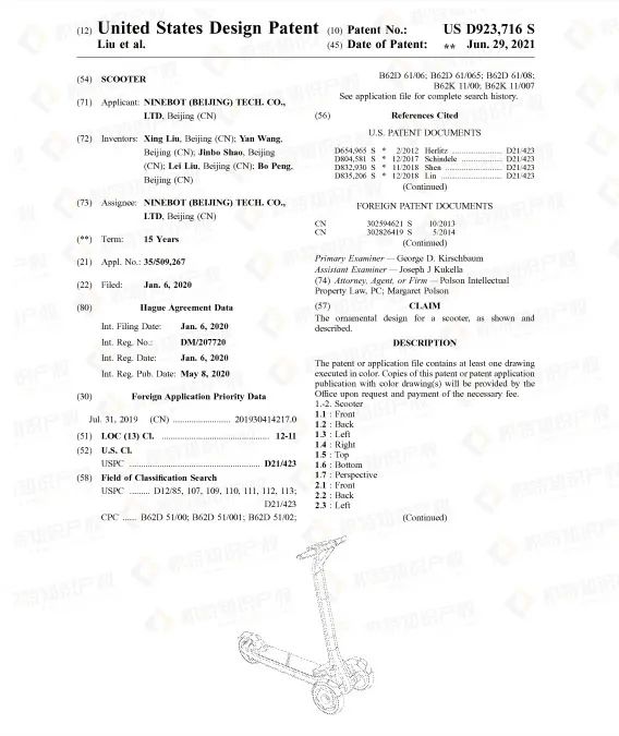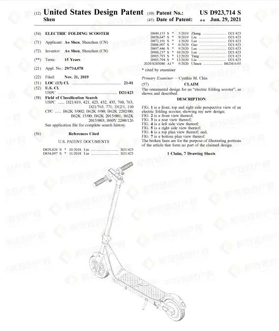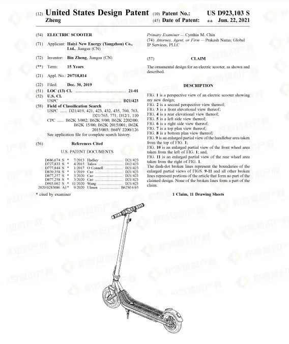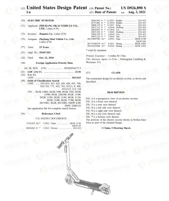 检索发现,2021年获得授权的滑板车外观专利不少,维权可能性比较高,要格外留意: