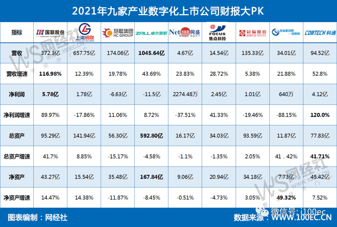 近日,产业数字化上市公司中,国联股份(603613.SH)、上海钢联(300226.SZ)、慧聪集团(02280.HK)、卓尔智联(02098.HK)、生意宝(002095.SZ)、焦点科技(002315.SZ)、冠福股份(002102.SZ)、药易购(300937.SZ)、科通芯城(00400.HK)等纷纷发布2021年财报。对此,网经社对这九家公司2021年财报进行汇总及解读。(详见网经社专题:http://www.100ec.cn/zt/2021cyszhcb/)