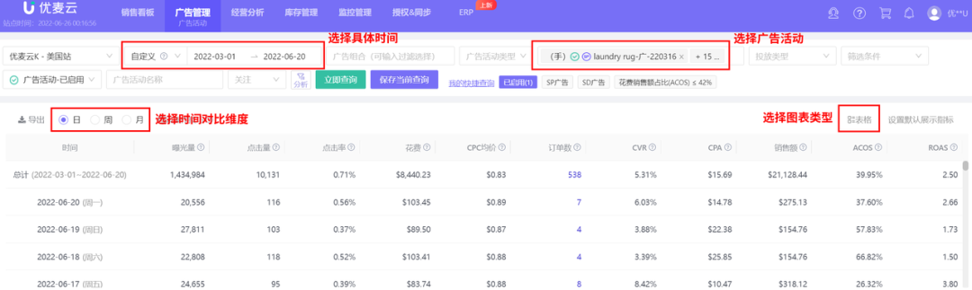 按时间(天/周/月),或按广告活动、广告组、关键词等类型,统计对应的数据表现。
