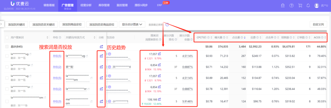 通过搜索词与产品的相关程度,流量转化情况,判断Listing质量好坏,针对无关词一键否定,优质词多重投放;