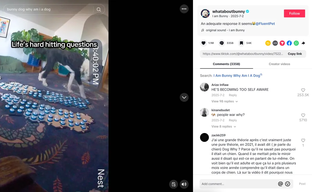 而当Bunny在一期视频中按下“陌生人”和“镜子”来质疑自我存在时,这种带有哲学色彩的内容迅速突破宠物圈层,在 TikTok引发了现象级讨论。