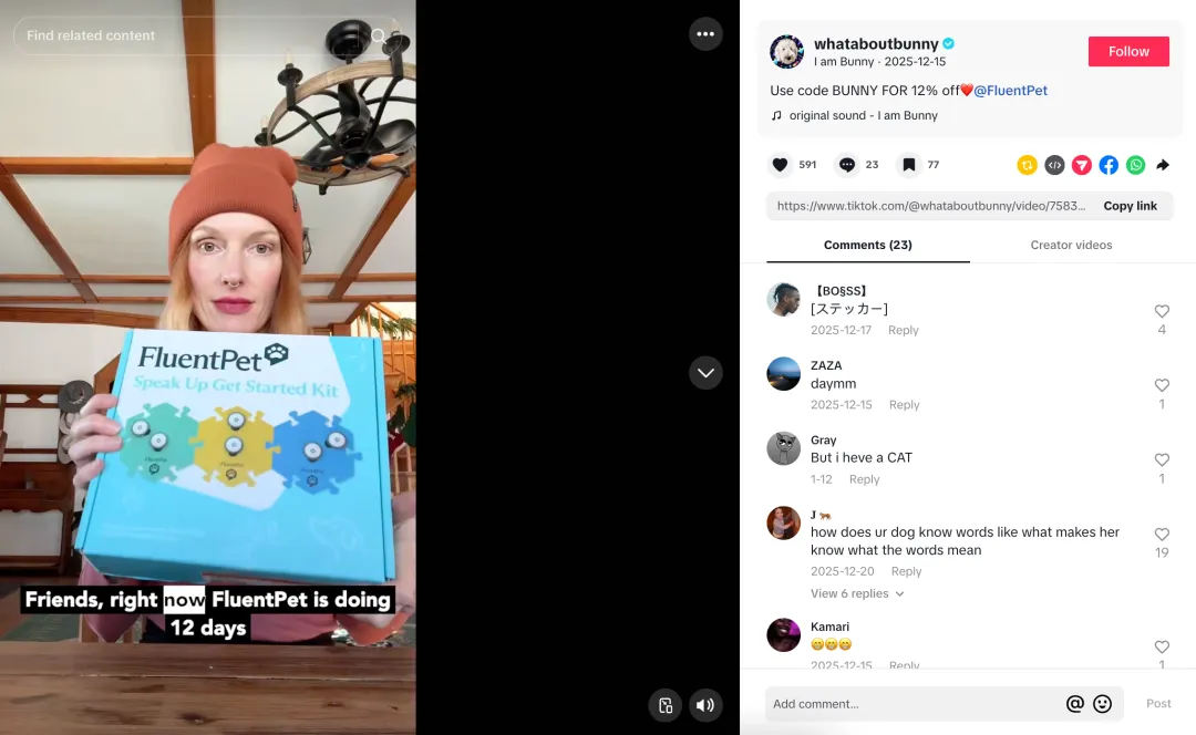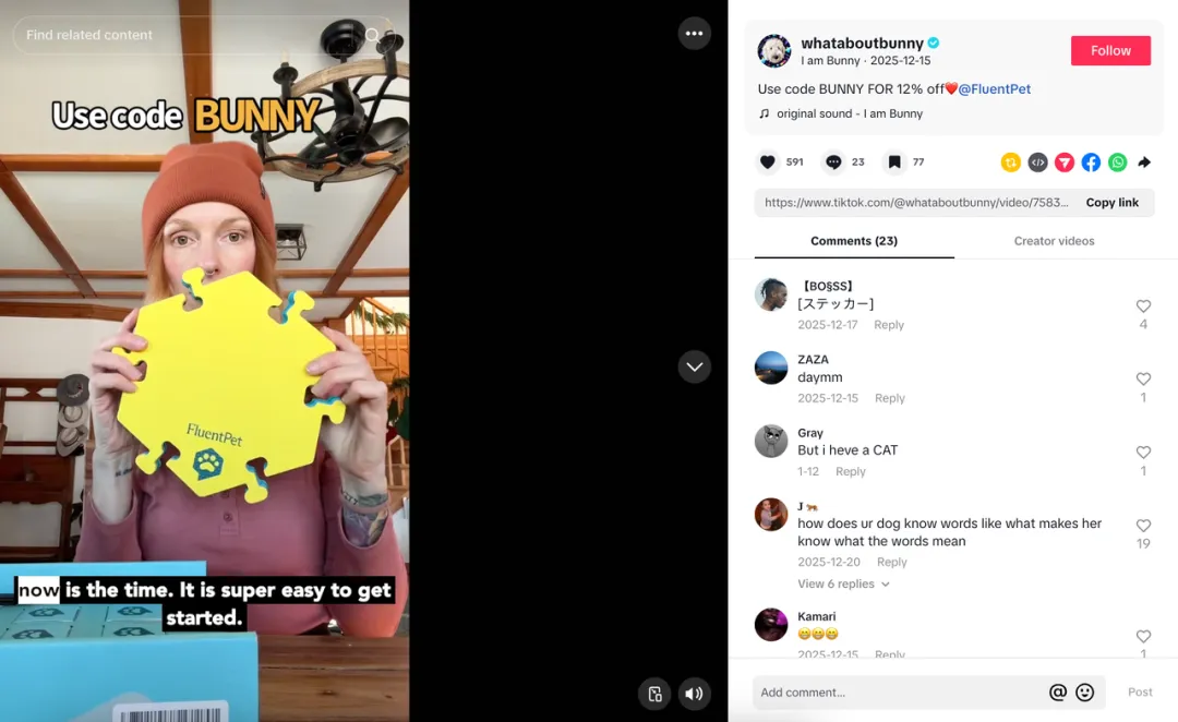 FluentPet并没有把自己定位成一个单纯的硬件厂商,而是一个“人宠交互案例”的记录者。通过观察其在TikTok和Instagram上的内容逻辑就能知道,品牌很少发直接的、没有吸引力的广告帖文,而是紧扣“科学验证”与“场景展示”这两个核心方向。