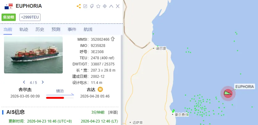 据搜航网战略合作伙伴中远海科旗下船视宝船舶定位显示,“Euphoria”轮已锚泊在豪尔费坎港附近。