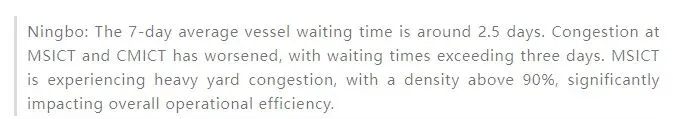 中国双枢纽: 宁波港等泊压力剧增,7天平均等泊时间延至2.5天,其中梅山(MSICT)和穿山(CMICT)码头堆场密度已超90%;