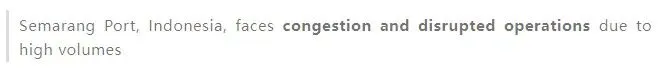 东南亚节点:印尼三宝垄港(Semarang)发出运营中断预警,丹戎埃马斯码头因进口积压严重,面临停摆风险。菲律宾马尼拉港船舶平均等待时间已超2天,堆场利用率居高不下。