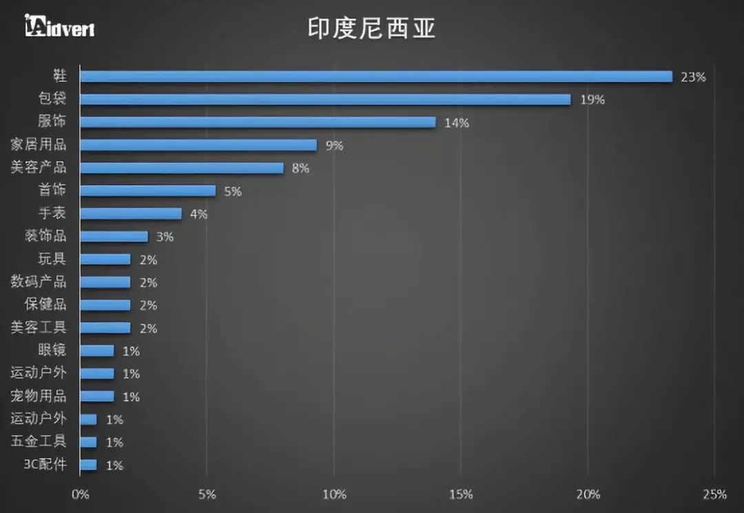 从瓦特-营销大数据平台提供的数据来看,目前,鞋、包袋、服饰、家居用品等产品最受印尼人欢迎。