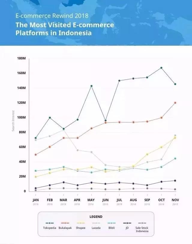 iprice的数据还披露,从11月的增长速率来看,增长最快的为JD,增长率高达246%,其次是Shopee,增长率高达158%,再其次是Tokopedia,增长率为94%。