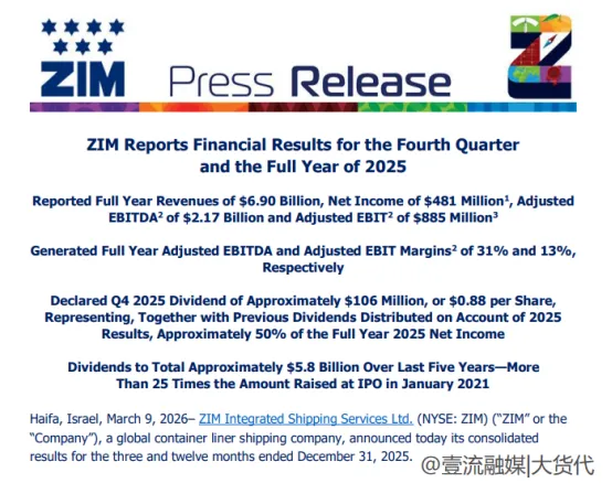 根据以星ZIM公布的财务报告显示,在2025年,公司全年实现营业收入69.0亿美元,同比下滑18.1%;