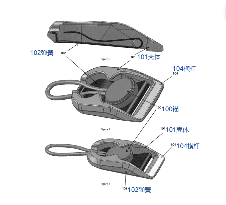 锚固件为刚性塑料圆盘,且永久固定于环形柔性绳; 外壳为塑料材质,且新增平行实心侧壁,与底座、前端共同形成锚固件容纳空间; 外壳底座集成横杆,且背带直接装配于横杆。