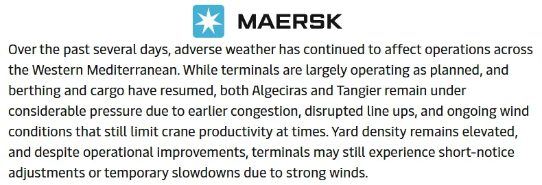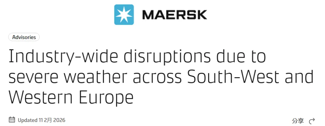 2月11日,马士基发布最通告,受持续性强风、暴雪及恶劣海况影响,西南及西欧多地港口与航线仍处于高度扰动状态,航运链条面临系统性延误风险。