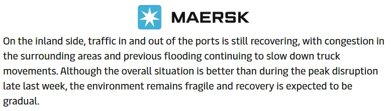 虽然部分码头已恢复靠泊与装卸,但由于前期积压严重、强风持续影响岸桥效率,堆场密度仍然偏高,短期内“边恢复 边拥堵”将成为常态。