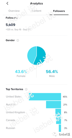 当你开通了Pro 账号后,你会看到你相应的后台数据界面有三个栏,包括“Overview”、“Content”、“Followers”。这篇文章isebel将主要讲解“Content”和“Followers”部分的数据应该怎么看?TikTok Analysitic中的“Followers”中主要展示用户关注数。这个部分主要是针对用户画像进行简单的数据分析,根据用户的不同标签,来展示用户的特征。“Gender” 表示对你的关注用户是男性用户和女性用户数据的分析。