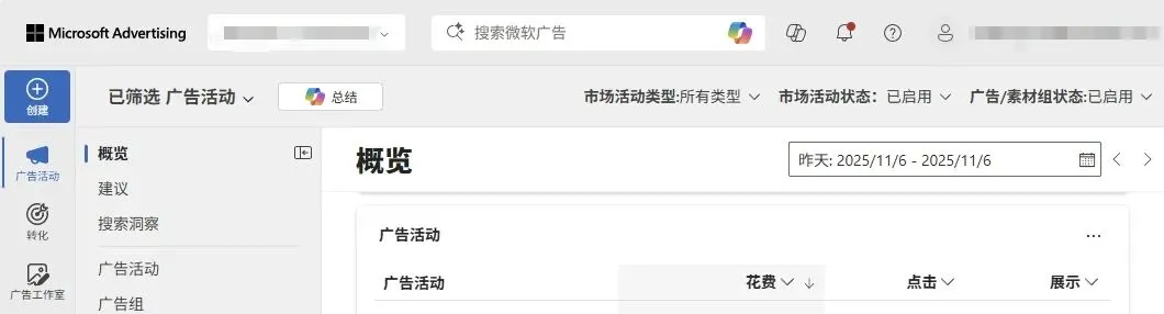 点击后便可查看与 Microsoft Ads 广告活动相关数据的部分,帮助广告主更深入地理解广告表现。