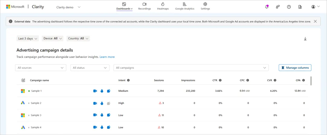 广告仪表板中的详细视图显示了关键广告指标,如曝光量(Impressions)、点击率 CTR(Click-through rate)、每次点击成本 CPC(Cost per click)、转化率 CVR(Conversion rate)和每次获客成本 CPA(Cost per acquisition)。以及 Clarity 会话数、广告活动意向以及每个广告活动对应的 Clarity 会话录制和热力图链接。需要注意的是,Clarity 广告仪表板使用所关联的广告账户设置的时区,而 Clarity 仪表板则使用用户本地的时区,如果这两个使用的时区不一致,则可能会导致广告活动数据在 Clarity 仪表板呈现时出现不匹配的情况,所以最好是尽可能确保关联的广告账户和 Clarity 后台都使用相同的时区。