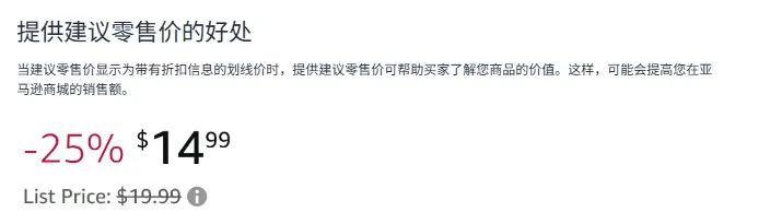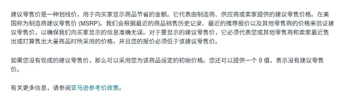另外要注意,划线价其实就是厂家或卖家提供的建议零售价(MSRP),亚马逊会对照站内成交和外部平台价格来验证,确保它是真实可信的参考价,不是虚标用来误导买家的。而且划线价和后面要说的常规价,前台都会以划线价(删除线价格)的形式显示,用来给买家做比价参考,一旦验证不过,这个比价优势就没了。