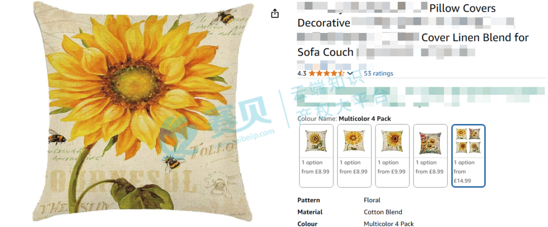 这幅作品以向日葵为核心元素,花瓣和叶片的笔触细腻写实,背景的文字和图案兼具装饰性,将艺术美感与装饰性完美融合。在侵权判定方面,很容易聚焦于“未经授权使用相似图案”这一点。所以,卖家如果店铺里有类似花卉、装饰风格的设计,一定要仔细排查,避免侵权。