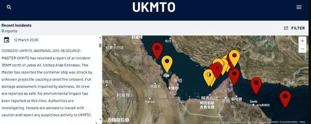 来自外媒和英国海事贸易组织(UKMTO)的报道和报告显示,3月12日清晨这艘由马士基与赫伯罗特共营的集装箱船“Source Blessing”在波斯湾阿联酋杰贝阿里港以北约35海里处被不明物体击中后,导致船体机舱区域发生火灾。