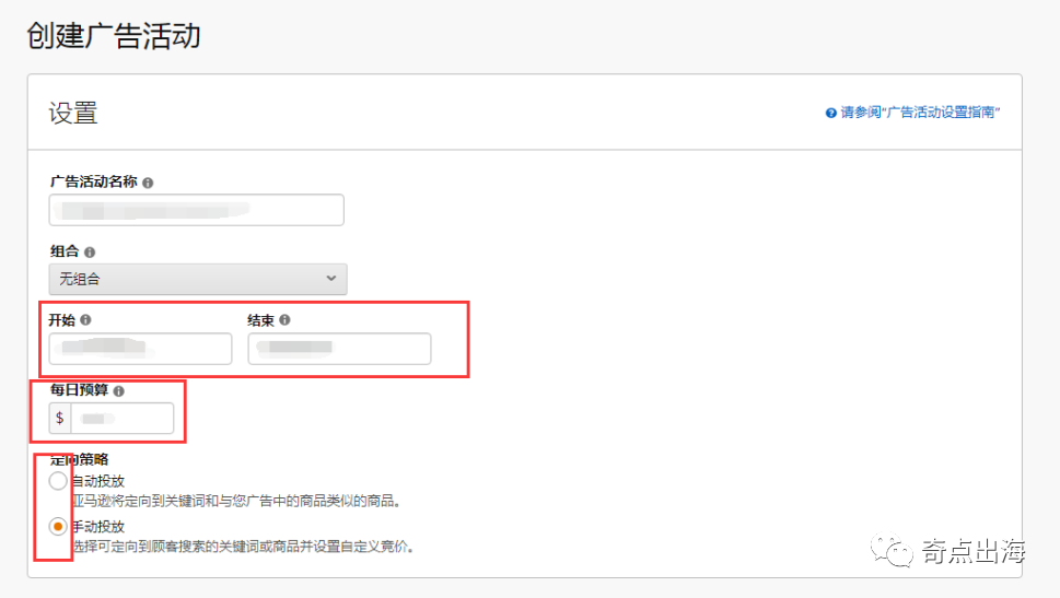 在创建商品推广广告活动时,我们需要设置好广告的投放时间和每日预算,选择自动或者手动投放方式并选择合适的竞价策略。