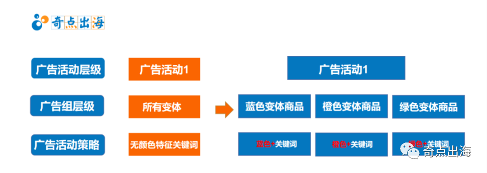直接创建一个新的广告活动?可以是可以,但是其实我们在广告组层级去进行操作会更加便于管理。如下图所示,不同的广告组推广不同的颜色的变体,然后分别主打与颜色相关的关键词。