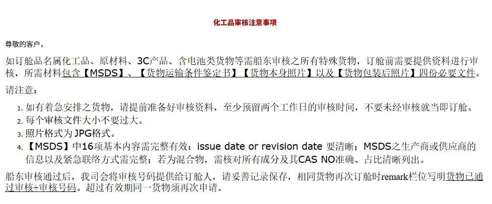 如有着急安排之货物,请提前准备好审核资料,至少预留两个工作日的审核时间,不要未经审核就当即订舱。