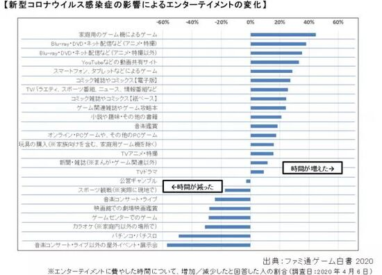 但疫情却改变了这一现象。疫情席卷之下,民众不得不在家中度过更长时间,游戏、动漫之外,用户需要更加多元的线上娱乐方式。根据日本2020年的一份调查,受疫情影响,日本民众花在各种娱乐项目上的时间发生了巨大变化。近40%的受访者表示,观看网络直播等所花的时间有所增加。