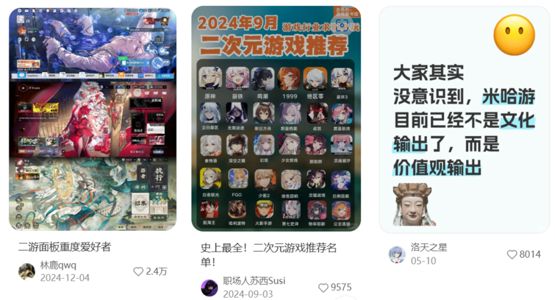 2025年第一季度的数据指出,小红书上的Z世代用户合计占比高达85%,其用户画像和泛二次元用户的特征高度重合。这种天然的用户基因,也直接反映在小红书的内容生态中。2024年,二次元及游戏相关内容成为小红书内容发布量增速TOP5的类目,二次元内容同比增长175%,游戏内容增长168%。