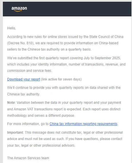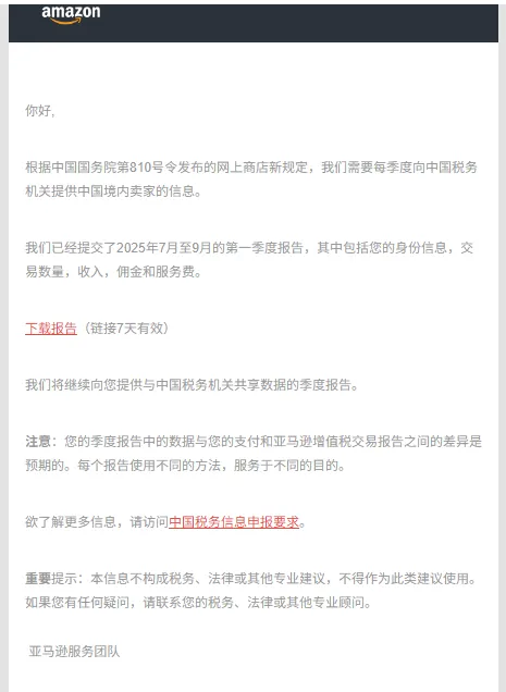 亚马逊的这则通知核心内容是:根据中国国务院第810号令,亚马逊需要每季度向中国税务机关提供中国境内卖家的相关信息,并且会同步给卖家一份数据副本。