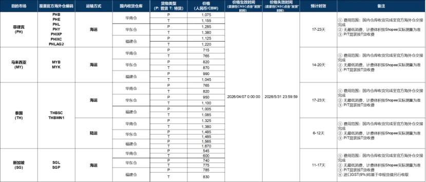 4月28日消息,2026年五月(2026年5月1日-2026年5月31日)Shopee官方海外仓官方头程服务渠道费率将沿用2026年四月价卡,完整费率如表所示。