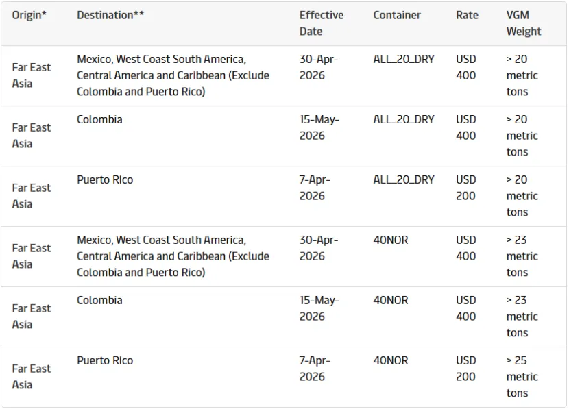 4月28 日消息,2026年4月30日起从亚洲港口至墨西哥、南美西海岸、中美洲及加勒比地区(不含哥伦比亚和波多黎各)。20尺干货箱若VGM总重超过20吨每箱加收400美元;40尺冷藏箱超过23吨每箱加收400美元。亚洲发往哥伦比亚的货物生效日期为2026年5月15日。