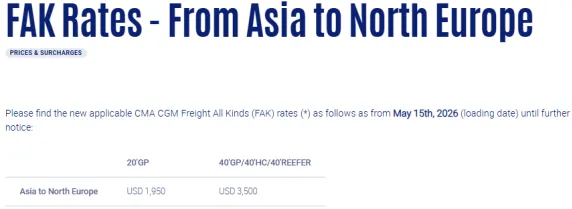 4月28日消息,5月15日(以起运港装船日为准)起,所有亚洲港口至所有北欧港口,20尺普柜及40尺普柜/高柜/冷藏箱执行费率标准如下。