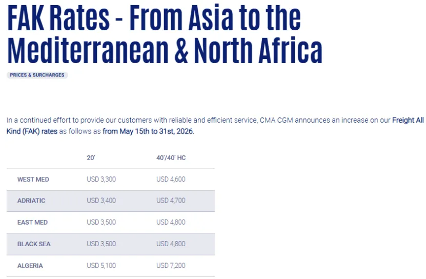 5月15日起至5月31日(以起运港装船日为准),所有亚洲港口至地中海全境(西地中海、亚得里亚海、东地中海、黑海)及北非(马格里布地区)。