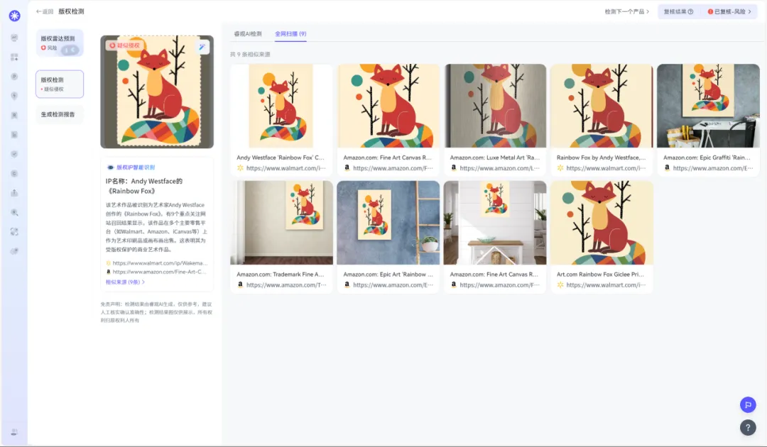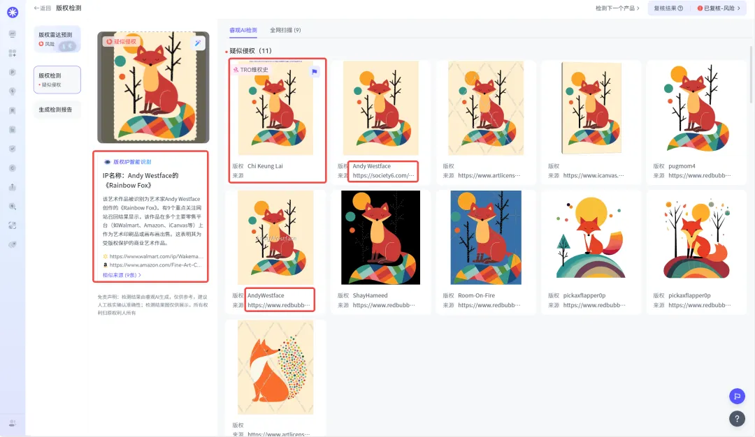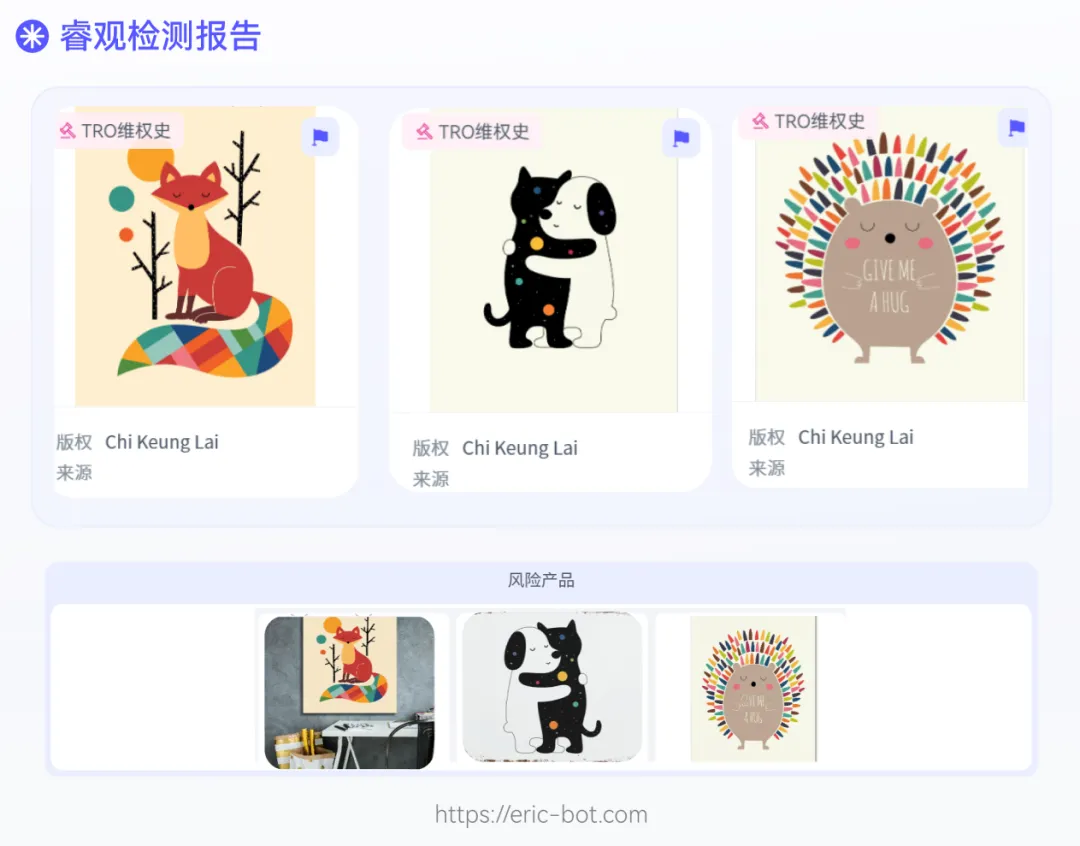 小睿将此次发起维权的图片上传至睿观独家自研的版权检测功能后发现,Chi Keung Lai彩虹动物系列插画作品已有生效TRO维权史。此外,该作者还以AndyWestface为名在Redbubble/Society6/icanvas等平台上架商品。