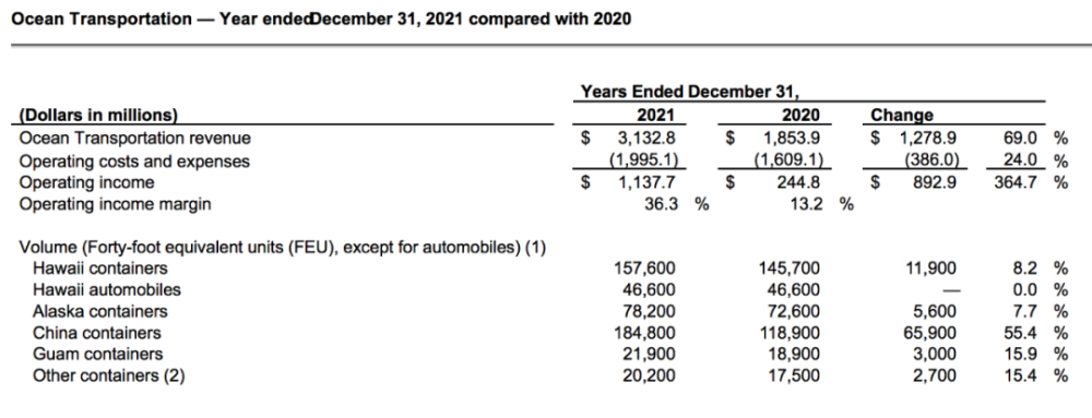此外,美森海运部门2021年全年的营收为31.33亿美元,同比增长69%;营业利润为11.37亿美元,同比增长3.6倍。