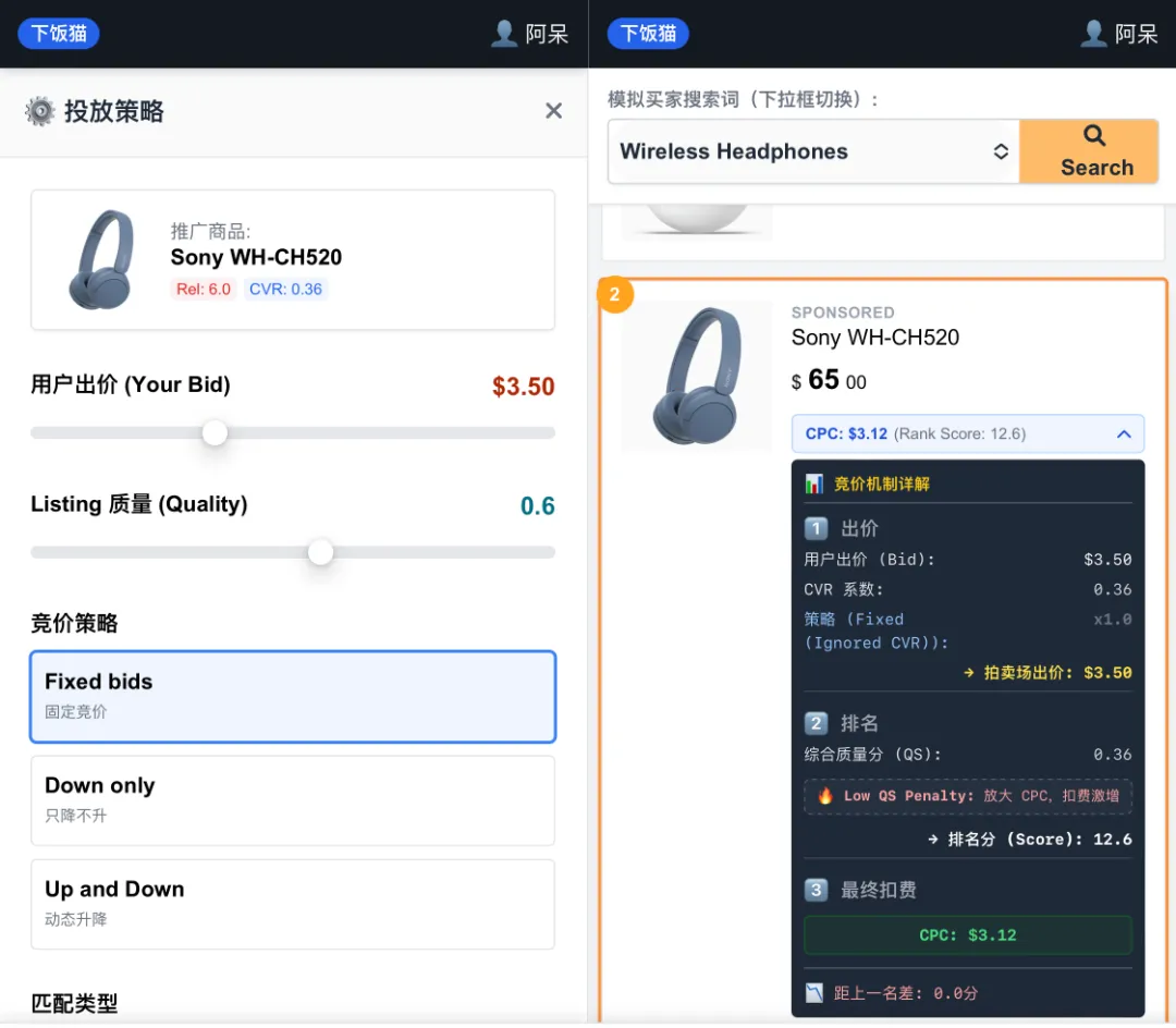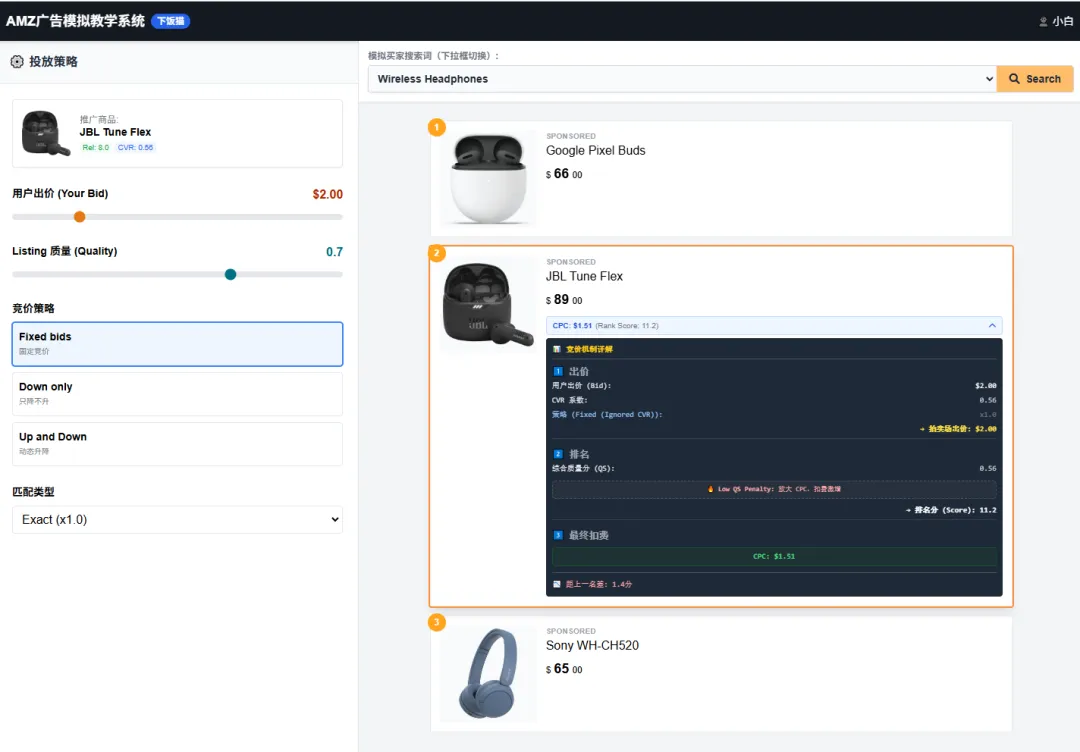 又比如3号位的Sony不甘心,想冲一冲排名。但由于综合得分(这里简单的以质量分,关键词相关性,转化率为对照参数)太低,虽然赢得了2号广告位,即便之前的JBL,没人兜底了,现在变成了底价2美金。当前Sony还是遭受了低质量强行竞价的惩罚,实际支出为很高的3.12美金水平。
