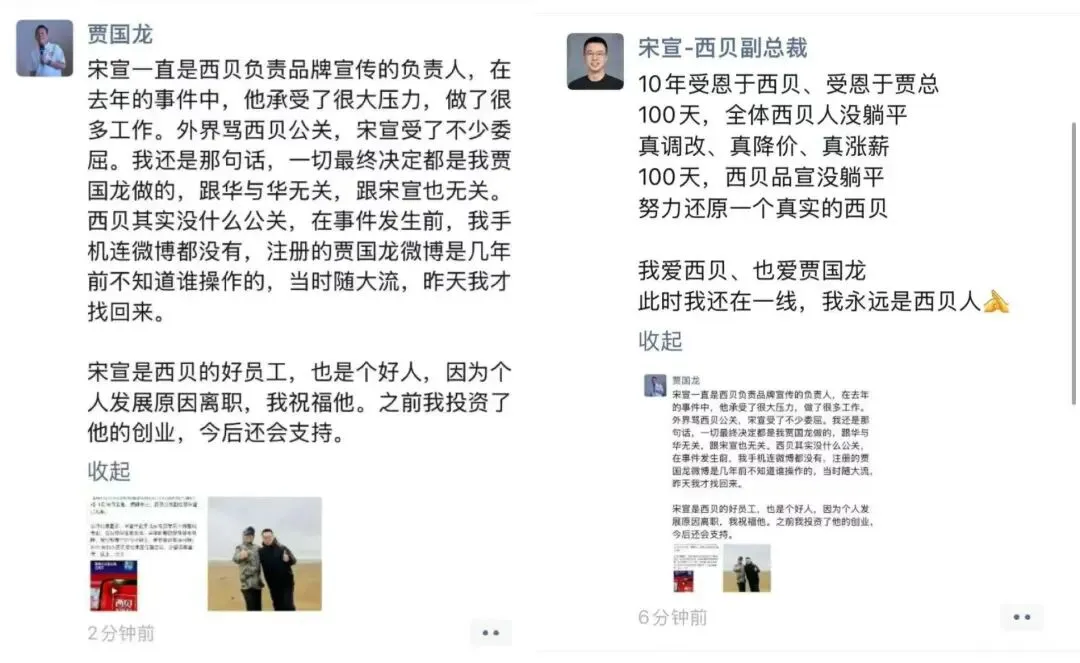 1月16日,界面新闻获悉西贝公关副总裁宋宣已离职。西贝餐饮创始人贾国龙在个人朋友圈发文称,宋宣因为个人发展原因离职,“在去年的事件中,他承受了很大压力,做了很多工作。”宋宣也在个人微信朋友圈称,“此时还在一线,永远是西贝人”。