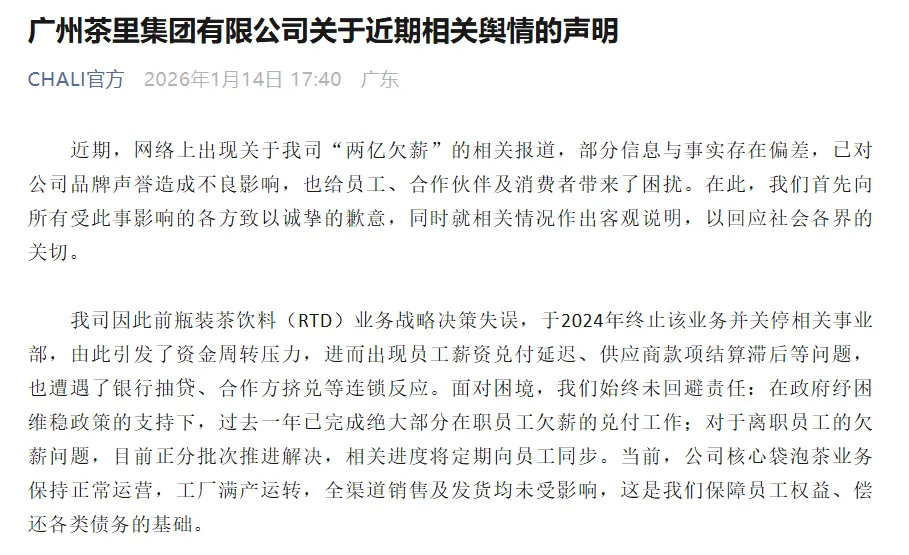 据此前报道,CHALI茶里深陷欠薪风波,多名自称茶里的员工在社交平台爆料称,茶里薪资拖欠严重,部分员工已有数月未得薪资,公积金也已数月未正常缴纳。