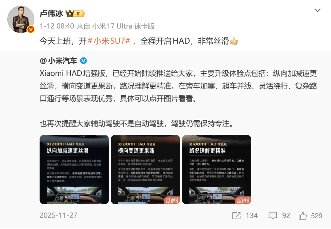 近日,有市场消息称小米集团合伙人、总裁卢伟冰辞职,引发部分网友关注。微博词条数据显示,“小米卢伟冰辞职”话题已有60.6万阅读量。值得注意的是,卢伟冰在微博认证的小米职务并未发生变化。1月12日,卢伟冰还转发了小米汽车动态,并配文称“今天上班”,用上班动态辟谣离职传闻。