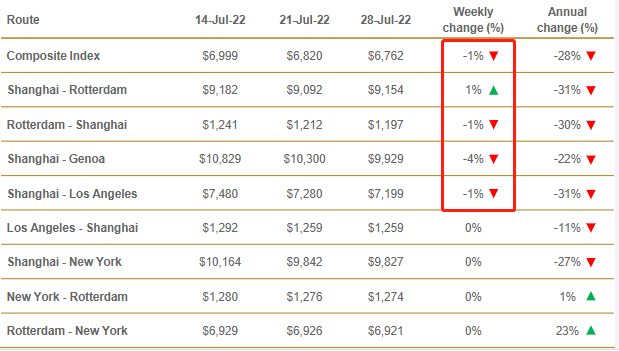 远东到美东下跌98美元至9348美元/FEU,跌幅1%; 远东到欧洲运价为5416美元/TEU,较上周下跌154美元,跌幅2.7%;