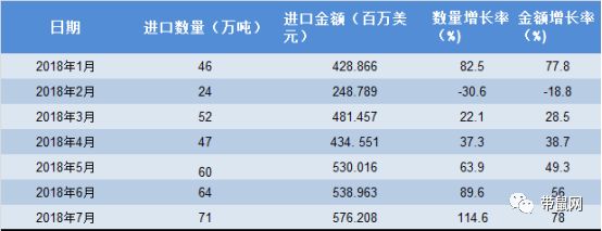 2018年1-7月中国纸及纸板进口数量及金额增长率情况