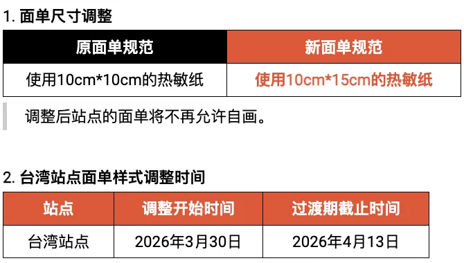 据 Shopee 消息,为进一步提升包裹处理时效,提供更好的物流服务体验,自 2026 年 3 月 30 日(北京时间)起,Shopee 将逐步调整台湾站点的 SLS 面单规范。此次面单规范调整涉及面单尺寸及面单样式变化。