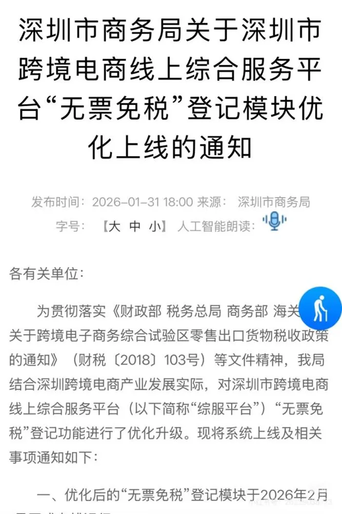1月31日深圳市商务局发布了一则关于深圳跨境电商线上综合服务平台“无票免税”登记模块优化上线的通知。优化后的“无票免税”登记模块于2月1日正式上线运行。