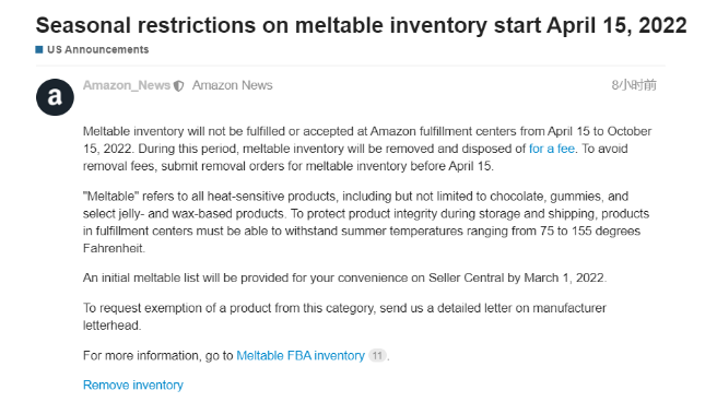2022年4月15日至2022年10月15日期间,亚马逊运营中心将不配送或不接受可融化产品库存。在此期间可融化库存将被移除并收取处置费用。为避免产生移除费用,请卖家在4月15日之前提交可融库存的移除订单。