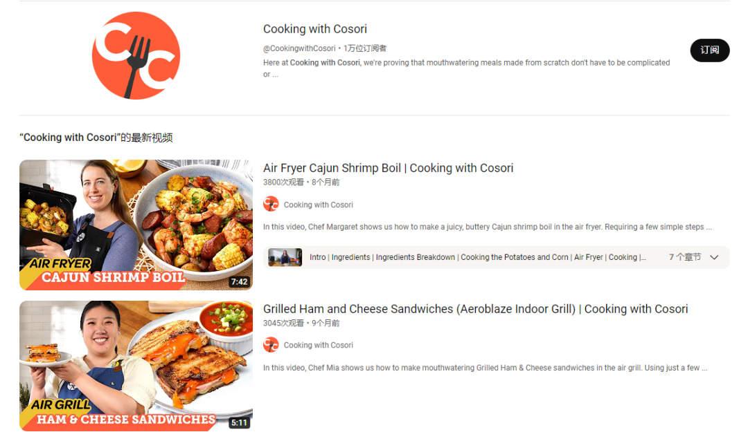 另一方面,Cosori还开设了名为“Cooking with Cosori”的YouTube频道,邀请当地知名KOL(Key Opinion Leader)来分享使用Cosori产品制作美食的经验和技巧。