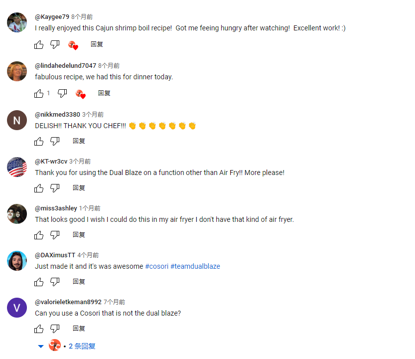 Cosori在这些平台上侧重提供对美食爱好者有价值的内容,吸引用户参与互动,如点赞、评论、分享等,从而增加用户粘性和忠诚度,拓展了用户群体、增强了专业性和可靠性,并提供了实用价值和互动性,从而在社交媒体上取得了良好的效果。目前,YouTube频道已经有超过1万的观众订阅,而观众们对这类型内容的丰富程度也赞口不绝。