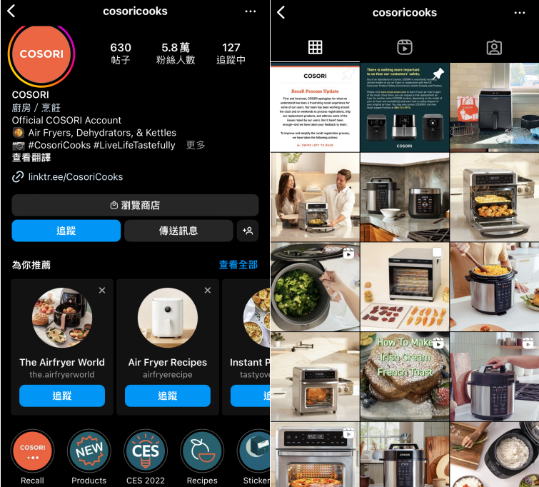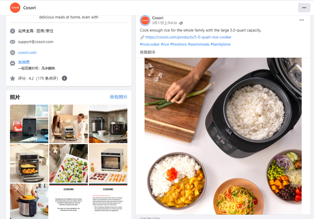 在FaceBook、Instagram等图文类社交媒体上,Cosori的展示主要以产品图片和菜谱教程为主,为消费者呈现出一系列美观、实用、兼具创意和功能性的家电产品。