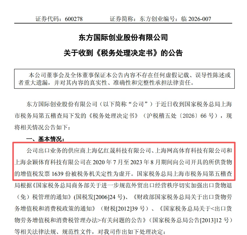 东方创业此次涉税风波,源于2020年7月至2023年8月期间的体育用品出口业务。