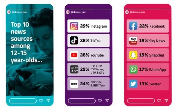 除此之外,Ofcom 的年度报告还显示,对于 12-15 岁的青少年来说,Instagram 现在是最受欢迎的新闻平台,紧随其后的是 TikTok 和 YouTube。